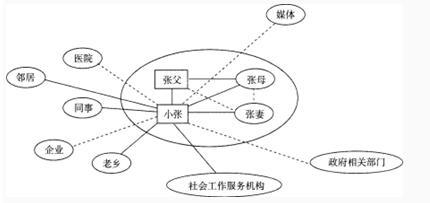 社会工作者在预估中,绘制了小张的社会生态系统图: