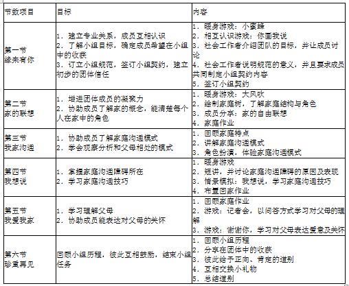 b.具体目标。通过小组工作的形式,帮助小组成员表达自己的情感需求;协助小组成员与家人多接触,多沟通,注意观察、了解家庭成员的沟通模式;协助成员解决与家人相处过程中遇到的困难。