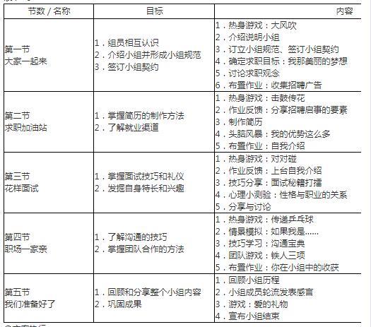 b.具体目标:了解自身的人格特点和兴趣;求职简历的制作;面试技巧的学习和训练;了解和利用社会的各种求职渠道;学习和训练团队合作精神;设计初步的就业目标以及相应的职业计划。