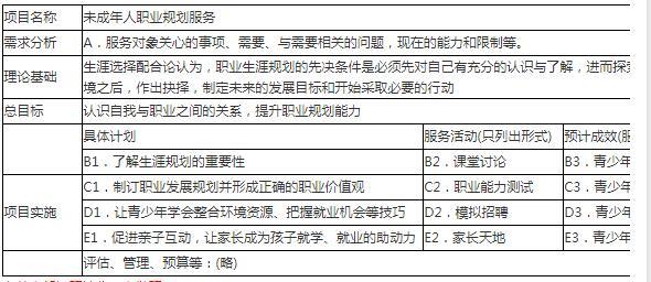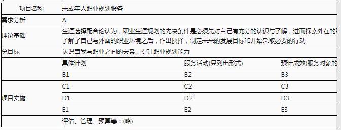 依据生涯选择配合论,设计一份“未成年人职业规划服务”的项目计划书(只需把需求分析、具体目标、服务活动形式和预计成效四部分答案,依据表4—3中所列字母的顺序填写)。