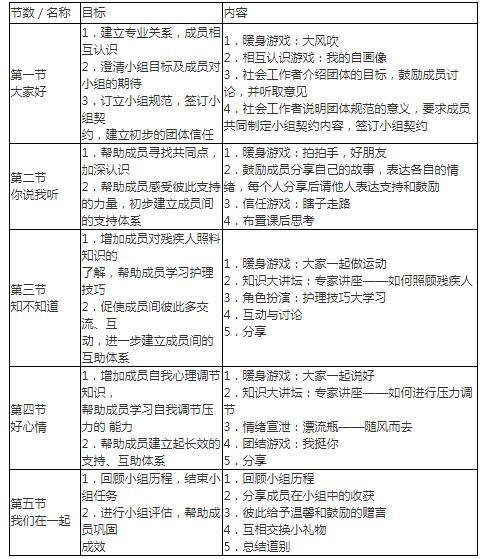 具体目标:通过专家培训,提升残疾人照顾者的护理技能;通过小组内学习和训练,有效调节自我压力;通过小组活动,形成有效的相互支持和帮助网络。