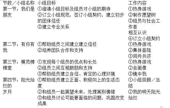 (2)小组工作目标:协助青少年理清思路,正确认识自己,纠正不良行为;掌握正确的同辈交往方式,树立人生目标,培养健康积极的正向行为。