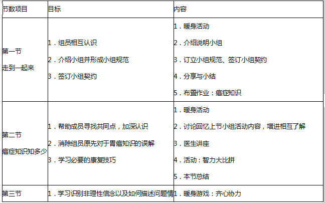 b.具体目标:协助组员澄清对胃癌的相关误解,帮助组员学习实用的康复技巧,缓解组员因疾病产生的情绪障碍,同时为组员提供更多的社会支持。