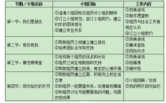 (2)小组工作目标:协助青少年理清思路,正确认识自己,纠正不良行为;掌握正确的同辈交往方式,树立人生目标,培养健康积极的正向行为。