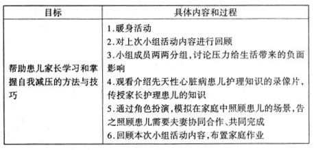 2.完善该方案:(1)暖身活动;(2)邀请专家,具体指导患儿家长学习和掌握自我减压的方法和技巧;(3)请术后成功融入社会的患儿家庭现身说法,介绍成功经验;(4)观看有关患儿成功以后手术康复及以后的开学、就业的录像;(5)就如何更好的减压这个话题相互讨论;(6)回顾本次活动,布置家庭作业。