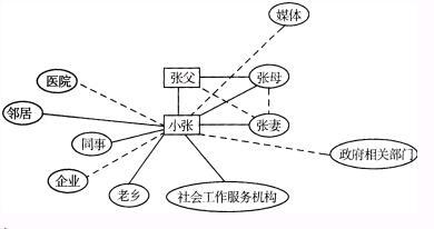 社会工作者在预估中,绘制了小张的社会生态系统图: