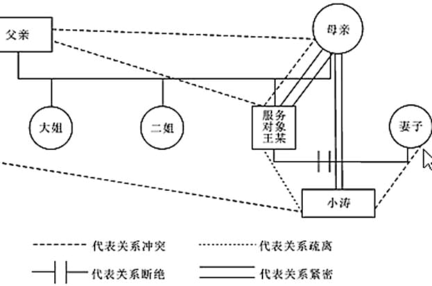(1)家庭界限不清,不能适应家庭成长周期的变化。亲子次系统存在着跨代联结、纠缠、疏离等现象。由于家庭生命周期不同,子女独立家庭阶段、调整阶段甚至老年人家庭阶段,父母与子女的纠缠性的家庭互动的方式已经不能适应新变化。虽然服务对象王某早已步入中年,但由于和家人之间长期代际界限不清晰,彼此过分卷入,使服务对象一直以来没有获得独立性发展的机会,所以王某会因为房子的过户、孩子抚养费用等问题与父母发生冲突。