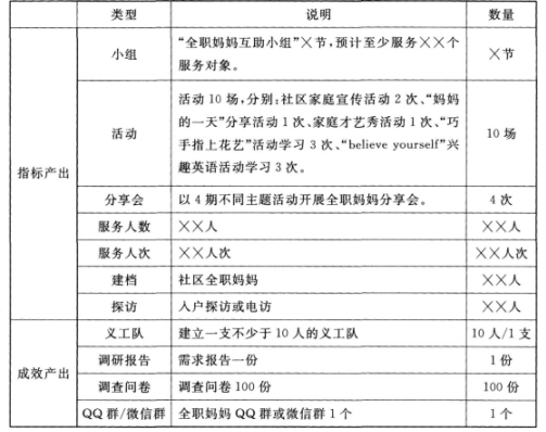 1.问题的陈述与分析 全职妈妈的生活重心围绕着家庭,接送孩子、做饭、打扫卫生成为生活的全部,这些枯燥、重复的工作使得全职妈妈容易情绪压抑、烦躁、易抱怨;容易忽视自我需要;少有自己的时间和娱乐。出现这些问题的原因有以下几点:一是全职妈妈受传统男主外,女主内的家庭观念影响,在工作与家庭无法兼顾的无奈下选择了做全职妈妈;二是家人及丈夫认为全职妈妈不上班就应该做家务照顾孩子,这都是全职妈妈的分内事,不仅较少给予关注和肯定,而且较少主动分担家务;三是全职妈妈对家庭付出的价值难以以金钱体现,没有固定的收入,全职妈妈的经济很难独立,这些使得全职妈妈本身对自己的付出和价值也产生了怀疑,这些都加重了全职妈妈的生活压力与苦恼,更有甚者变得精神抑郁。 针对这一问题,本项目可以从三方面入手: (1)采用优势视角理论,挖掘全职妈妈的自我优势和资源,为其增能。 (2)全职妈妈的心理调适,帮助她们找准定位,调整心态,提升全职妈妈的信心和自我价值感。 (3)采用社会支持理论,为全职妈妈构建社会支持网络,从家人、同辈、社区等角度提升他人对全职妈妈的理解与肯定。 2.项目设计 (1)项目名称:幸福家庭,由你支撑 (2)项目目标 总目标:提升全职妈妈的自我认同感,打破家庭、社会对全职主妇的固化认知。 具体目标: ①倡导家庭成员认识到全职妈妈对家庭的付出和辛劳,体谅全职妈妈的辛苦。 产出:开展社区调研一次;开展社区家庭宣传活动两场;至少 ××人次社区居民参与,80%参与人次认同全职妈妈价值。 ②帮助丈夫了解全职妈妈对家庭的奉献,认识到全职妈妈是幸福家庭的支撑者。 产出:开展分享 “妈妈的一天”活动一次;家庭才艺秀活动一次;至少夫妻及家庭××组参与。 ③为全职妈妈开展各项技能学习,为他们重返职场做准备。 产出:开展 “巧手指上花艺”活动学习3次;开展“believe yourself”兴趣英语活动学习3次,参与活动学习全职妈妈××人次。 ④成立全职妈妈互助小组,开展小组活动让她们彼此鼓励支持。 产出:建立全职妈妈QQ群、微信群;定期开展全职妈妈交流分享会;全职妈妈 ××人次。 (3)服务内容 ①介入理论:优势视角理论和社会支持理论 通过开展各项活动,帮助全职妈妈学习各项技能,帮助她们认识到自身优势,同时建立全职妈妈互助小组,开展社区活动等,为全职妈妈构建家庭、同辈、社区支持。 ②项目明细 (4)项目管理:项目预算、人员分工、风险评估、资源整合。 (5)项目监测与评估 ①实施方评估:实施方评估包括项目执行中的监测工作和项目结束时的评估工作。 监测方面,根据项目的评估指标(活动量、参与者和成效)与评估方法,在每次活动、小组结束后进行评估、反思;项目年中和年终阶段完成项目成效报告。 评估方面,项目后期会以问卷调查、座谈会、同工评估等方式相结合,收集项目对服务对象的成效及影响。 ②第三方评估:在项目结束后,会以资助方所邀请的第三方评估标准为主,对本项目进行全面评估。