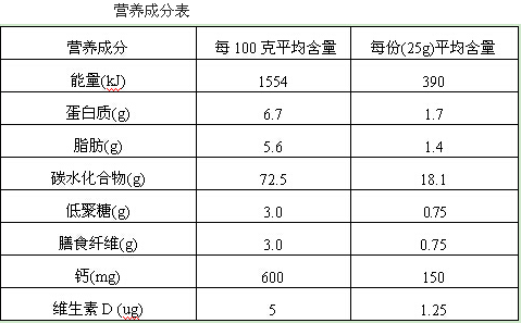 (1) 营养成分表:标有食品营养成分名称和含量的表格,标注能量和蛋白质、脂肪、碳水化合物、钠等4种核心营养素及其含量。如每100g平均含量:能量1554kJ、蛋白质6.7g、脂肪5.6g、碳水化合物72.5g、(缺少钠及含量),低聚糖3.0g、膳食纤维3.0g、9种维生素、6种矿物质,同时标注每份(25g)的能量及营养素含量。 (2) 营养声称:描述和说明食物营养特性,富含水溶性膳食纤维、丰富钙质及促进钙吸收的维生素D3。 (3)营养成分功能声称:指某营养成分可维持人体正常生长、发育和正常生理功能等作用的声称,如:维生素D3可促进钙的吸收,有助于增加骨密度;水溶性膳食纤维有助于维持正常的肠道功能,防止便秘。