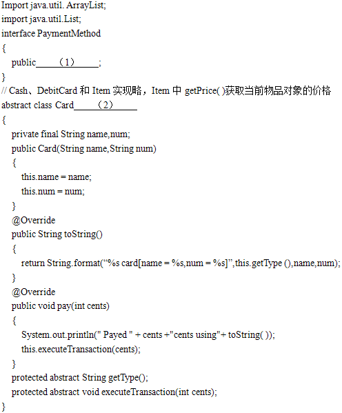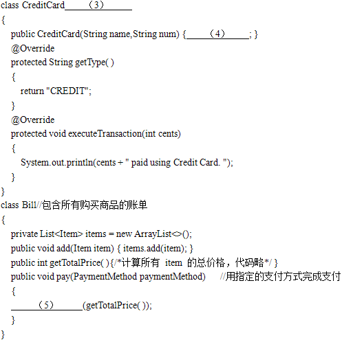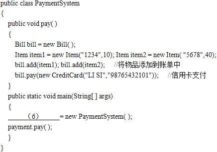 (1)void pay(int cents) (2)implements PaymentMethod (3)extends Card (4)super(name,num) (5)paymentMethod.pay (6)PaymentSystem payment 解析:在图示中,PaymentMethod中有pay方法,且在实现类中Card也有pay方法,所以第一空填void pay(int cents);PaymentMethod是个接口,里面的方法在实现类当中进行具体实现,实现类是Card和Cash,所以第二空填implements PaymentMethod;第三空填CreditCard类与其他类的关系,可以发现它继承了Card类,所以这里填extends Card;第四空是CreditCard内有构造方法,并将方法内的参数传递给父类的私有成员,所以填super(name,num);第五空根据传入的paymentMethod对象,调用pay方法,传入getTotalPrice()的值,所以这里填paymentMethod.pay,利用语句PaymentSystem payment=new PaymentSystem()创建一个PaymentSystem类的对象,对象名为payment,然后开始调用pay方法。