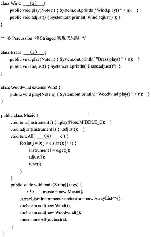 以下Java代码实现一个简单乐器系统,音乐类(Music)可以使用各类乐器(Instrument)进行演奏和调音等操作。对部分乐器进行建模,其类图如下图所示,包括:乐器(Instrument)、打击乐器(Percussion)、弦乐器(Stringed)、管乐器(Wind)、木管乐器(Woodwind)、铜管乐器(Brass)。