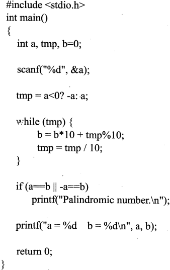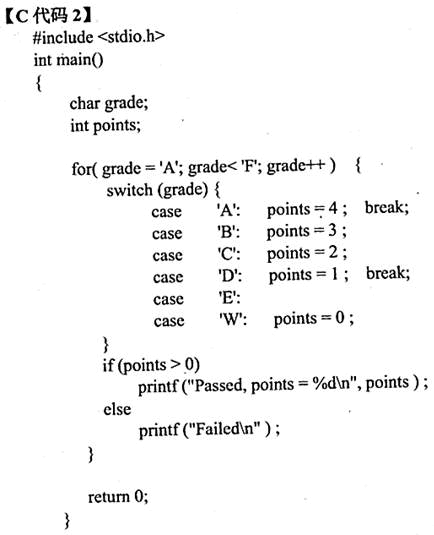 (1)输入-1331的结果是: Palindromic number. a=-1331 b=1331 输入795的结果是: a=795 b=597 (2)输出结果是: Passed,points=4 Passed,points=1 Passed,points=1 Passed,points=1 Failed 解析:(1)程序1实现了回文数的判断,首先判断a的正负性,若为负,则temp=-a,若为正,则temp=a,接下来对temp进行逆序输出,将其结果赋给b,如果a绝对值与b相等,即a为回文数,则输出:Palindromic number.;a=a;b=b;否则只输出a=a;b=b。 (2)程序2中主要考察了switch的用法,当case语句中没有出现break时,将会向下继续执行下一条语句,而不会退出switch,因而当case语句中没有break时,执行过程中points被重复赋值。故当“case'A'”执行时,points=4退出,此时输出“Passed,points=4”,而当grade='B'、'C'、'D'时,都执行到“case'D'::points=1;break;”时才退出,故输出了三个“Passed,points=1”;当grade='W'时超出了for循环中grade的范围,不执行这一语句,所以只有当grade='E',输出一句“Failed”。所以最终输出结果为: Passed,points=4 Passed,points=1 Passed,points=1 Passed,points=1 Failed