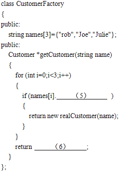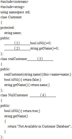 (1)virtual (2)virtual (3):public Customer (4):public Customer (5)compare(name)==0 (6)new NullCustomer() (7)cf=new CustomerFactory(); 解析:本题考察使用C++代码实现实际问题。 (1)在C++中,动态绑定是通过虚函数来实现的。此处用到了虚函数,所以要在成员函数原型前加一个关键字声明,故应填virtual。 (2)同(1)。 (3)类realCustomer是类Customer的派生类,因此应填public Customer。 (4)同(3)。 (5)这里判断是否与数据库中的人名相符,故应填compare(name)==0。 (6)函数执行到这里,说明没有找到用户,应当返回一个空用户,此处应填:new NullCustomer()。 (7)对象均有工厂对象产生,故应先创建创建工厂对象,故应填cf=new CustomerFactory()。