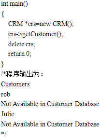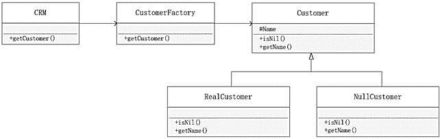 以下C++代码实现一个简单客户关系管理系统(CRM)中通过工厂(CustomerFactory)对象来创建客户(Customer)对象的功能。客户分为创建成功的客户(realCustomer)和空客户(NullCustomer)。空客户对象是当不满足特定条件时创建或获取的对象。类间关系如图所示。