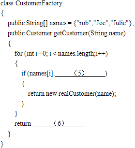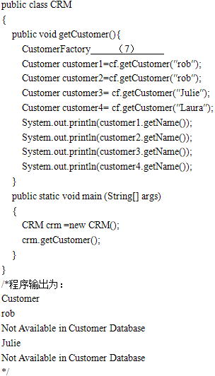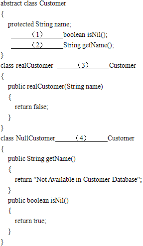 (1)abstract (2)abstract (3)extends (4)extends (5)equals(name) (6)new NullCustomer() (7)cf=New CustomerFactory(); 解析:本题考察Java程序设计客户关系管理系统。 (1)Customer是抽象类,其中的实现方法应声明为抽象方法,则此处应填abstract。 (2)同(1)。 (3)realCustom实现了Customer抽象类,应当使用extends声明,故应填extends。 (4)同(3)。 (5)此处应判断判断名字是否在数组集合内,故应填equals(name)。 (6)当不满足条件时,应当创建一个空客户对象,故应填new NullCustomer()。 (7)若想使用客户工厂对象,应创建其实例,则此处应填cf=New CustomerFactory()。