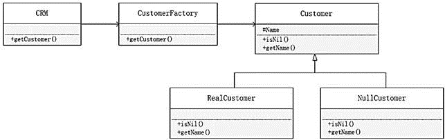 以下Jave代码实现一个简单客户关系管理系统(CRM)中通过工厂(CustomerFactory)对象来创建客户(Customer)对象的功能。客户分为创建成功的客户(realCustomer)和空客户(NullCustomer)。空客户对象是当不满足特定条件时创建或获取的对象。类间关系如下图所示。