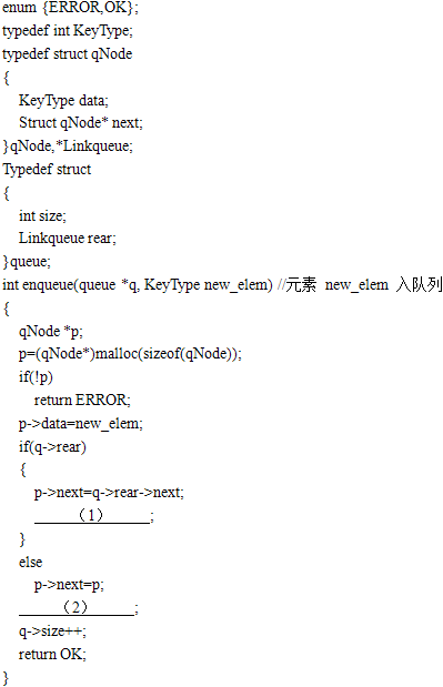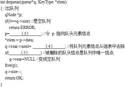 (1)q->rear->next=p (2)q->rear=p (3)q->rear→next (4)p->next (5)q->rear==p或p->next==p或q->size==1 解析:本题考察C语言指针与链表的知识,为入队列和删除队列问题。 (1)对于入队列,当队列q不为空时,p的队尾元素要指向原q的队尾指向的元素,而原q队尾指向的元素应指向p,故(1)处应填q->rear->next=p。 (2)当队列q为空时,插入p元素,则p的队尾指向p自身,即:p->next=p,且整个队列q的队尾也是p,故(2)处应填q->rear=p。 (3)对于队列删除元素p,先判断q是否为空,为空队列则返回错误;否则,应当令p指向队头元素结点,队头元素结点可用q->rear->next表示,因此(3)填q->rear->next。 (4)此时,p转化为头结点,p出列,则需要q的队尾指向p的下一个元素,因此(4)中应填p->next。 (5)最后,判断被删除的队头结点是否是队列中的唯一结点,可采用:q->rear==p或p->next==p或q->size==1等表示方法,故(5)中应填q->rear==p或p->next==p或q->size==1。