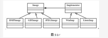某图像预览程序要求能够查看BMP、JPEG和GIF三种格式的文件,且能够Windows和Linux两种操作系统上运行。程序需具有较好的扩展性以支持新的文件格式和操作系统。为满足上述需求并减少所需生成的子类数目,现采用桥接(Bridge)模式进行设计,得到如图5-1所示的类图。
