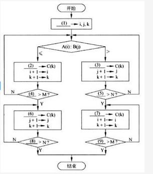 阅读以下说明和流程图,填补流程图中的空缺(1)~(9),将解答填入对应栏内。1、【说明】假设数组A中的各元素A(1),A(2),…,A(M)已经按从小到大排序(M≥1);数组B中的各元素B(1),B(2),…,B(N)也已经按从小到大排序(N≥1)。执行下面的流程图后,可以将数组A与数组B中所有的元素全都存入数组C中,且按从小到大排序(注意:序列中相同的数全部保留并不计排列顺序)。例如,设数组A中有元素:2,5,6,7,9;数组B中有元素2,3,4,7:则数组C中将有元素:2,2,3,4,5,6,7,7,9。【流程图】