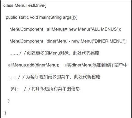 阅读下列说明和Java代码,将应填入(n)处的字句写在对应栏内。某饭店在不同的时段提供多种不同的餐饮,其菜单的结构图如图5-1所示。