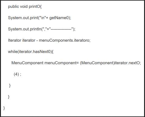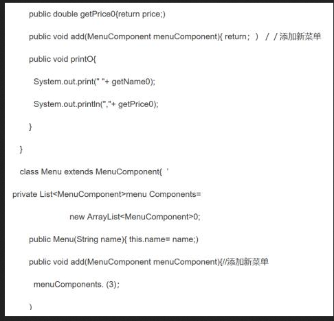 (1) abstract class或public abstract class(2) public abstract void add (MenuComponent menuComponent)或abstract void add (MenuComponent menuComponent)或protected abstract void add (MenuComponent menuComponent)(3) add (menuComponent)(4) menuComponent.print ()(5) allMenus.print ()
