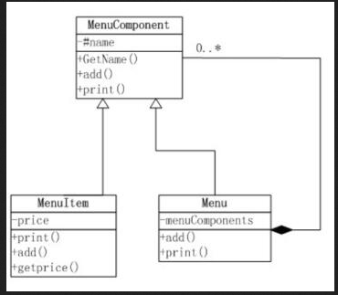 现在采用组合(Composition)模式来构造该饭店的菜单,使得饭店可以方便地在其中增加新的餐饮形式,得到如图5-2所示的类图。其中MenuComponent为抽象类,定义了添加(add)新菜单和打印饭店所有菜单信息(print)的方法接口。类Menu表示饭店提供的每种餐饮形式的菜单,如煎饼屋菜单、咖啡屋菜单等。每种菜单中都可以添加子菜单,例如图5-1中的甜点菜单。类MenuItem表示菜单中的菜式。