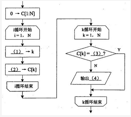 阅读以下说明和流程图,填补流程图和问题中的空缺(1)~(5),将解答填入答题纸的对应栏内。【说明】设整型数组A[1:N]每个元素的值都是1到N之间的正整数。一般来说,其中会有一些元素的值是重复的,也有些数未出现在数组中。下面流程图的功能是查缺查重,即找出A[1:N]中所有缺的或重复的整数,并计算其出现的次数(出现次数为0时表示缺)。流程图中采用的算法思想是将数组A的下标与值看作是整数集[1:N]加上的一个映射,并用数组C[1:N]记录各整数出现的次数,需输出所有缺少的或重复的数及其出现的次数。【流程图】