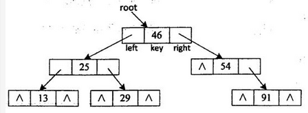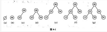 阅读以下说明和C代码,填补代码中的空缺,将解答填入答题纸的对应栏内。【说明】二叉查找树又称为二叉排序树,它或者是一棵空树,或者是具有如下性质的二叉树。(1)若它的左子树非空,则左子树上所有结点的值均小于根结点的值。(2)若它的右子树非空,则右子树上所有结点的值均大于根结点的值。(3)左、右子树本身就是两棵二叉查找树。二叉查找树是通过依次输入数据元素并把它们插入到二叉树的适当位置上构造起来的,具体的过程是:每读入一个元素,建立一个新结点,若二叉查找树非空,则将新结点的值与根结点的值相比较,如果小于根结点的值,则插入到左子树中,否则插入到右子树中;若二叉查找树为空,则新结点作为二叉查找树的根结点。根据关键码序列{46,25,54,13,29,91}构造一个二叉查找树的过程如图4-1所示。