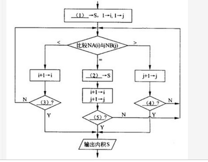 (1)0 (2)S+A(i)B(j)或等价表示 (3)i>m或i=m+1或等价表示 (4)j>n或j=n+1或等价表示 (5)i>m or j>n或i=m+1 or j=n+1或等价表示 【解析】 本题是简化了的一个大数据算法应用之例。世界上每天都有大量的新闻网页,门户网站需要将其自动进行分类,并传送给搜索的用户。为了分类,需要建立网页相似度的衡量方法。流行的算法是,先按统一的关键词组计算各个关键词的词频,形成网页的特征向量,这样,两个网页特征向量的夹角余弦(内积/两个向量模的乘积),就可以衡量两个网页的相似度口因此,计算两个网页特征向量的内积就是分类计算中的关键。 对于存在大量零元素的稀疏向量来说,用题中所说的简化表示方法是很有效的。这样,求两个向量的内积只需要在分别从左到右扫描两个简化向量时,计算对应序号相同(NA(i)=NB(j))时的A(i)*B(j)之和(其他情况两个向量对应元素之乘积都是0)。因此,流程图中(2)处应填S+A(i)*B(j),而累计的初始值S应该为0,即(1)处应填0。 流程图中,NA(i)<NB(j)时,下一步应再比较NA(i+1)<NB(j),除非i+1已经越界。因此,应先执行i+1→i,再判断是否i>m或i=m+1(如果成立,则扫描结束)。因此(3)处应填i>m或i=m+1。 流程图中,NA(i)>NB(j)时,下一步应再比较NA(i)<NB(j+1),除非j+1已经越界。因此,应先执行j+1→j,再判断是否j>n或j=n+1(如果成立,则扫描结束)。因此(4)处应填j>n或j=n+1。 (5)处应填扫描结束的条件,i>m or j>n或i=m+1 or j=n+1,即两个简化向量之一扫描结束时,整个扫描就结束了。