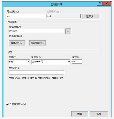 图2-3是配置添加网站的界面,图中"测试设置"的内容包括(7)和授权。采用图中配置,点击确定按钮后,系统弹出的提示是(8)。(8)备选答案:A.未配置主机名,确定以后再添加主机名。B.端口已经分配,确定是否重复绑定端口。