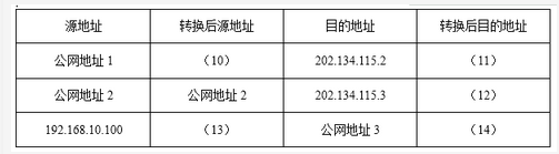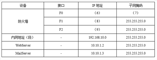 (6)——(9)备选答案:A.202.134.115.5B.10.10.1.1C.10.10.1.255D.192.168.10.1E.255.255.255.0F.255.255.255.248G.192.168.10.0H.202.134.115.8I.255.255.255.224【问题4】(每空1分,共6分)如表3-3所示是防火墙上的过滤规则,规则自上而下顺序匹配。为了确保网络服务正常工作,并保证公司内部网络的安全性,请将下表补充完整【问题3】(每空1分,共5分)为使互联网用户能够正常访问公司WWW和邮件服务,以及公司内网可以访问互联网。公司通过防火墙分别为Webserver和MailServer分配了静态的公网地址202.134.115.2和202.134.115.3。如表3-2所示是防火墙上的地址转换规则,请将下表补充完整。