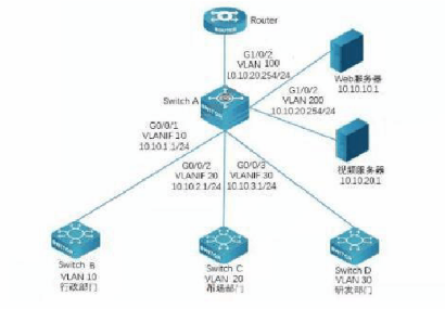 某企业的网络结构如图4-1所示 问题:4.1(6分)根据4-1所示,完成交换机的基本配置,请根据描述,将以下配置代码补充完整。 <HUAWEI>(1) [HUAWEI](2) Switch[Switch]vlan(3)102030100200[Switch](4)gigabitethernet0/0/1 [Switch-GigabitEthernet0/0/1]portlink-type(5) [Switch-GigabitEthernet0/0/1]porttrunkallow-passvlan(6) [Switch-GigabitEthernet0/0/1]quit[Switch]interfacevlanif10 [Switch-Vlanif10]ipaddress10.10.1.1.255.255.255.0[Switch-Vlanif10]quit VLAN2030100200配置略...... 问题:4.2按照公司规定,禁止市场部和研发部工作日每天8:00~18:00访问公司视频服务器,其他部门和用户不受此限制。请根据描述,将以下配置代码补充完整。...... [Switch](7)satime8:00to18:00working-day [Switch]acl3002 [Switch-acl-adv-3002]ruledenyipsource10.10.2.0.0.0.0.255destination10.10.20.10.0.0.0timc-rangesatime [Switch-acl-adv-3002]quit [Switch]acl3003 [Switch-acl-adv-3003]ruledenyipsource10.10.3.0.0.0.0.255destination10.10.20.10.0.0.0time-rangesatime [Switch-acl-adv-3003]quit [Switch-acl-adv-3003]ruledenyipsource10.10.3.0.0.0.0.255destination10.10.20.10.0.0.0time-rangesatime [Switch-acl-adv-3003]quit [Switch]trafficclassifierc_market//(8 [Switch-classifier-c_market](9)acl3002//将ACL与流分类关联 [Switch-classifier-c_market]quit [Switch]trafficclassifierc_rd [Switch-classifier-c_rd]if-matchacl3003//将ACL与流分类关联 [Switch-classifier-c_rd]quit [Switch](10)b_market//创建流行为 [Switch-behavior-b_market](11)//配置流行为动作为拒绝报文通过 [Switch-behavior-bmarket]quit [Switch]trafficbehaviorb_rd [Switch-behavior-b_rd]deny [Switch-behavior-b_rd]quit [Switch](12)p_market//创建流策略 [Switch-trafficpolicy-p_market]classifierc_marketbehaviorb_market [Switch-trafficpolicy-p_market]quit [Switch]trafficpolicyp_rd//创建流策略 [Switch-trafficpolicy-p_rd]classifierc_rdbehaviorb_rd [Switch-trafficpolicy-p_rd]quit [Switch]interface(13) [Switch-GigabitEthernet0/0/2]traffic-policyp_market(14) [Switch-GigabitEthernet0/0/2]quit [Switch]interfacegigabitethernet0/0/3 [Switch-GigabitEthernet0/0/3]traffic-policy(15)inbound [Switch-GigabitEthernet0/0/3]quit