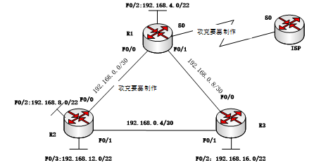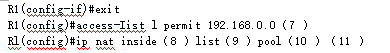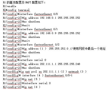 公司申请到202.111.1.0/29的公有地址段,采用NAPT技术实现公司内部访问互联网的要求,其中,192.168.16.0/22网段禁止访问互联网。R1、R2和R3的基本配置已正确配置完成,其中R1的配置如下。请根据拓扑结构,完成下列配置代码。