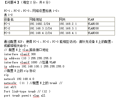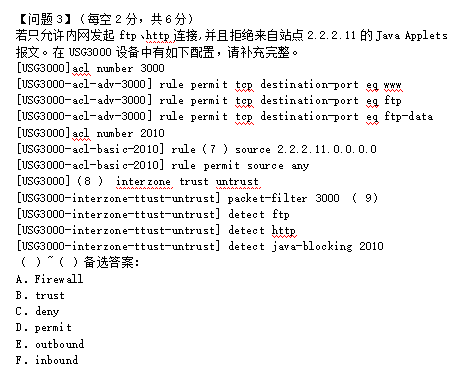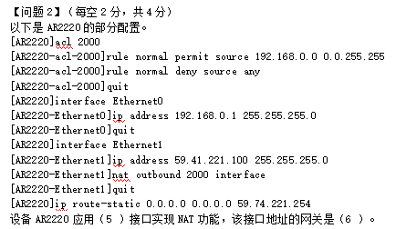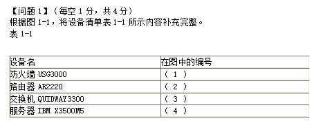 【问题1】参考答案:1.B,2.A,3.C 4.D【问题2】5.ethernet 1 6、59.74.221.254【问题3】7) C.deny 8、A 9.F【问题4】10)192.168.4.1 11)192.168.100.0 12)设置接口的类型是trunk 【解析】 【问题1】试题分析:这是一道简单的概念题,考察我们对企业园区网络的基本拓扑结构的了解。通常的企业为了确保内部网络的安全,会设置防火墙,防火墙有3个区域,外网,内网和DMZ区。DMZ通常用于存放各种服务器。因此首先可以选出B这个位置是防火墙,A用于连接Internet,是路由器。DMZ区内部有多台服务器,需要使用交换机连接。【问题3】试题分析:这是网络工程师考试第一次考华为的设备配置,而我们考前准备的都是ios的命令。那这道题是不是很难呢,其实这道题非常简单,只要我们有IOS的命令经验,这道题完全可以自己凭经验做出来,题目出题也是以选择题的形式,因此更加容易,对于没有用过华为设备的考生来说,也是非常简单的。 【问题4】试题分析:这道题同样是基本的配置,掌握基本命令即可。