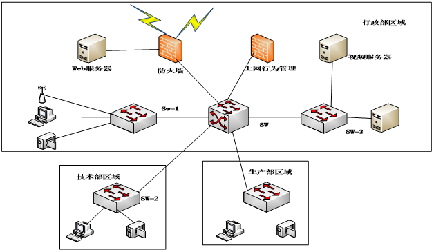 某企业的行政部、技术部和生产部分布在三个区域,随着企业对信息化需求的提高,现拟将网络出口链路由单链路升级为双链路,提升ERP系统服务能力以及加强员工上网行为管控。网络管理员依据企业现有网络和新的网络需求设计了该企业网络拓扑图1-1,并对网络地址重新进行了规划,其中防火墙设备集成了传统防火墙与路由功能。