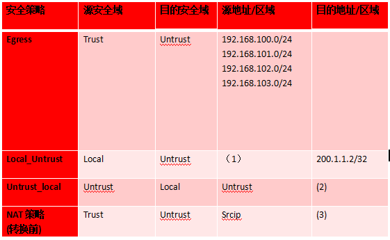 防火墙上配置NAT功能,用于公私网地址转换。同时配置安全策略,将内网终端用户所在区域划分为Trust区域,外网划分为Untrust区域,保护企业内网免受外部网络攻击。补充防火墙数据规划表1-2内容中的空缺项。