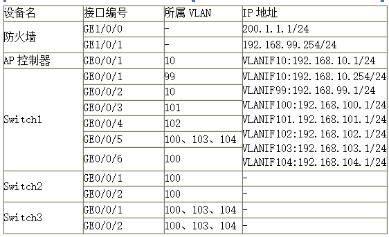 在Switch1上GEO/O/2连接AP控制器,该接口类型配置为()模式,所在VLAN是()