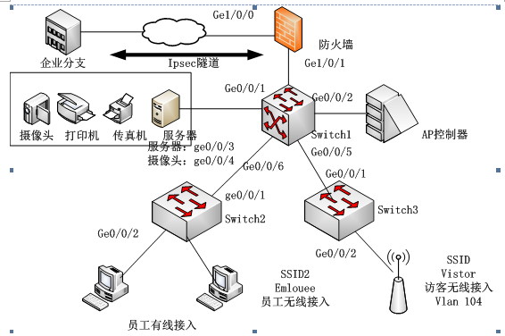 某企业组网方案如图1-1所示,网络接口规划如表1-1所示。公司内部员工和外部访客均可通过无线网络访问企业网络,内部员工无线网络的SSID为Employee,访客无线网络的SSID为Visitor。