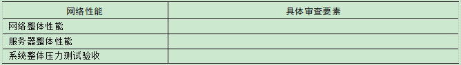 阅读下列说明,回答问题1至问题3,将解答填入答题纸的对应栏内。【说明】X新能源集团的信息网络系统建设工程进入收尾工作。各分项工程除视频会议系统外全部初验合格,视频会议系统计划本周内完成初验。机房内的网络系统经过安装调试并试运行后,正常连续运行2个月。空调全部摆放到位,验收时将加电启动。其他条件也符合集成合同及信息安全的要求。【事件1】承建单位认为已经满足工程验收的前提条件,要求下周验收。【事件2】在对网络基础平台进行验收时,监理工程师对网络性能列出的审查要素如下表所示: