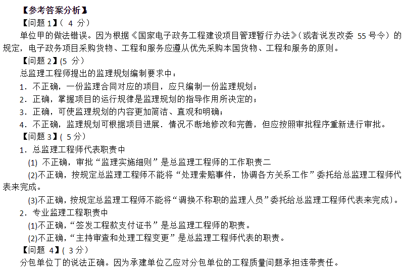 监理公司丙承担了建设单位甲业务信息系统建设的全过程监理任务。该系统的建设内容主要包括服务窗口受理子系统、档案管理子系统、网上申报子系统、统计分析子系统、数据中心、门户网站等应用开发和服务器、存储系统及系统软件的采购。甲以公开招标的方式选择了承建单位乙承担项目的建设任务。建设合同约定,乙将档案管理子系统和网上申报子系统建设任务分包给分包单位丁,建设单位甲自行采购所需的设备和系统软件。在项目执行过程中发生了以下几个事件: 事件1:了保证设备质量,甲要求设备采购优先选择进口名牌产品。 事件2:委托监理合同签订后,总监理工程师明确了项目监理规范编制的一些要求: 1.为了使监理规划具有针对性,准备编制两份监理规划。 2.监理规划要掌握项目运行规律。 3.监理规划的表达应标准化、格式化、规范化。 4.监理规划应根据项目实际情况进行编写,编写完成后由总监理工程师认可,便不准再行修改。 事件3:在起草的项目监理规划中规定了项目监理机构的人员岗位职责: 1.总监理工程师代表职责 (1)审查批准“监理实施细则” (2)理索赔事件,协调各方关系 (3)调换不称职的监理人员 2.专业监理工程职责 (1)签发工程款支付证书 (2)住持审查和处理工程变更 事件4:档案管理子系统开发结束,并根据实施合同的约定及测试标准进行验收。监理工程师对档案管理子系统涉及的档案数据质量产生质疑,要求采取抽测的方式进行验证。分包单位丁说:“我们已完成自测,抽测验证应由单位乙负责”。监理工程师要求承建单位乙派人抽测验证,乙说:“档案管理子系统已经全部承包给了公司丁,应该由他们进行抽测验证”。 【问题1】(4分) 针对事件1,单位甲的做法正确吗?请说明理由。 【问题2】(5分) 请指出事件2中总监理工程师提出的关于监理规划编制的各项要求是否正确,并分别说明理由。 【问题3】(5分) 在事件3中,项目监理机构的人员岗位职责的各项内容正确吗?分别说明理由。 【问题4】(3分) 针对事件4,单位乙和单位丁谁的说法正确?为什么?