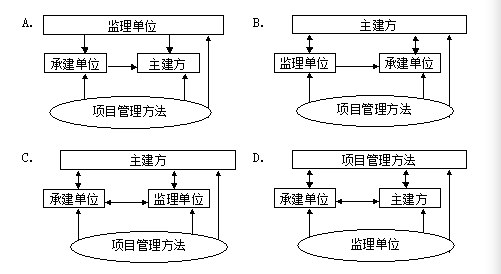 信息系统项目的实施涉及到主建方、承建单位和监理单位,而三方都需要采用项目管理的方法以完成其在项目实施中所担负的责任。下图()正确表达了这种“三方一法”的关系。