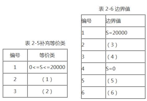 问题3:(6分)如果规定了单次刷卡的积分上限为20000(即S取值大于等于0且小于等于20000),则还需要针对S的取值补充一些测试用例。假设采用等价类划分法和边界值分析法来补充用例,请补充表2-5、表2-6中的空(1)~(6)。