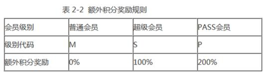 此外,公司C的会员分为普通会员、超级会员和PASS会员三个级别,超级会员和PASS会员在刷卡时有额外积分奖励,奖励规则如表2-2所示。