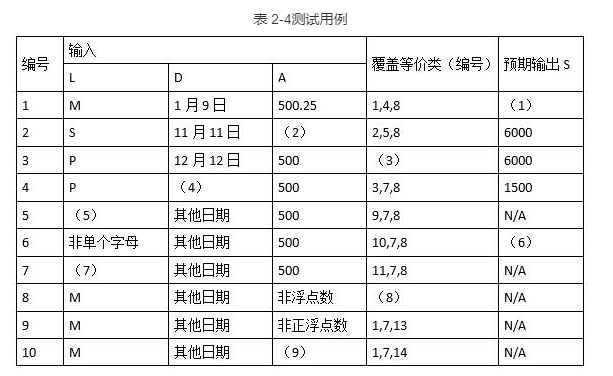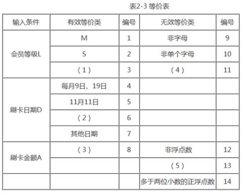 }银行B开发了一个程序来计算用户每次刷卡所累积的积分,程序的输入包括会员级别L、刷卡日期D和刷卡金额A,程序的输出为本次积分S。其中,L为单个字母且大小写不敏感,D由程序直接获取系统日期,A为正浮点数最多保留两位小数,S为整数。问题1:(5分)采用等价类划分法对该程序进行测试,等价类表如下表所示,请补充表2-3中空(1)~(5)。