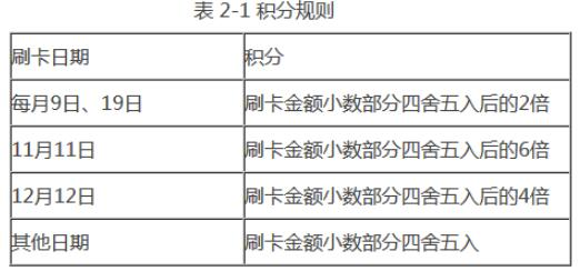 阅读下列说明,回答问题1至问题3,将解答填入答题纸的对应栏内。【说明】某银行B和某公司C发行联名信用卡,用户使用联名信用卡刷卡可累计积分,积分累计规则与刷卡金额和刷卡日期有关,具体积分规则如表2-1所示。