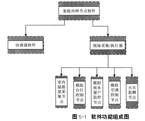 阅读下列说明,回答问题1至问题3,将解答填入答题纸的对应栏内。【说明】某智能家居系统软件设计中,家庭内网节点软件设计包括协调器软件、现场采集/执行器(室内温湿度采集节点、模拟台灯控制节点、模拟雨水窗户监控节点、模拟空调控制节点和火灾监测节点)的软件设计。软件功能组成如图5-1所示。