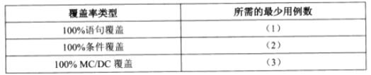 【问题3】(6分)覆盖率是度量测试完整性和测试有效性的一个指标。在嵌入式软件白盒测试过程中,通常以语句覆盖率、条件覆盖率和MC/DC覆盖率作为度量指标。在实现第4条功能时,设计人员采用了下列算法:if((数据有效==TRUE)&&(数据类型==室内环境数据)){数据经串口发送到网关;}if((数据有效==TRUE)&&(数据类型==控制指令)){向控制节点发送控制指令;}请指出对上述算法达到100%语句覆盖、100%条件覆盖和100%MC/DC覆盖所需的最少测试用例数目,并填写在表5-2的空(1)~(3)中。表5-2测试覆盖用例统计表