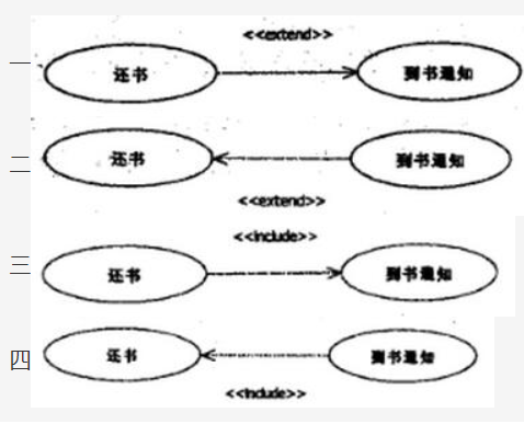 以下关于用例图的叙述中,不正确的是(1)。图书馆管理系统需求中包含“还书”用例和“到书通知”用例,对于“还书”用例,应先查询该书是否有人预定,若有则执行“到书通知”。“还书”用例和“到书通知’’用例是(2)关系,以下用例图中,(3)是正确的。管理员处理“还书”用例时,需要先执行“验证身份“用例,那么“还书”用例和“验证身份”用例之间是(4)关系。 3、____