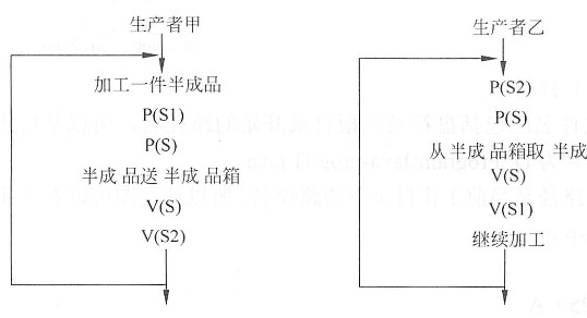某企业生产流水线M共有两位生产者,生产者甲不断地将其工序上加工的半成品放入半成品箱,生产者乙从半成品箱取出继续加工。假设半成品箱可存放n件半成品,采用PV操作实现生产者甲和生产者乙的同步可以设置三个信号量S、S1和S2,其同步模型如下图所示。信号量S是一个互斥信号量,初值为___1__;S1、S2的初值分别为__2___。 1、____