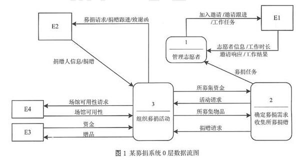 1、E1:志愿者 E2:捐赠人 E3:募捐机构 E4:场馆由题干中的关键信息"根据募捐任务给志愿者发送加入邀请、邀请跟进、工作任务;管理志愿者提供的邀请响应、志愿者信息、工作时长、工作结果等",结合如图1所示的0层数据流图中与实体E1相关的"加入邀请/邀请跟进/工作任务"这一条输入数据流,以及"志愿者信息/工作时长/邀请响应/工作结果"这一条输出数据流可知,实体E1的名称是"志愿者"。根据题干中给出的"根据活动时间,搜索场馆,即:向场馆发送场馆可用性请求,获得场馆可用性"等关键信息,结合图1中输入至实体E4的数据流"场馆可用性请求",以及输出数据流"场馆可用性"等可知,实体E4的名称是"场馆"。基于题干中给出的"根据相应的活动信息举办活动,从募捐机构获取资金并向其发放赠品"等关键信息,结合图1中输入至实体E3的数据流"赠品",以及输出数据流"资金"等可知,实体E3的名称是"募捐机构"。依据题干中给出的"从捐赠人信息表中查询捐赠人信息,向捐赠人发送募捐请求"等关键信息,结合图1中输入至实体E2的数据流"募捐请求",以及输出数据流"捐赠人信息"等可知,实体E2的名称是"捐赠人"。2、P1:确定活动时间范围 P2:搜索场馆 P3:推广募捐活动